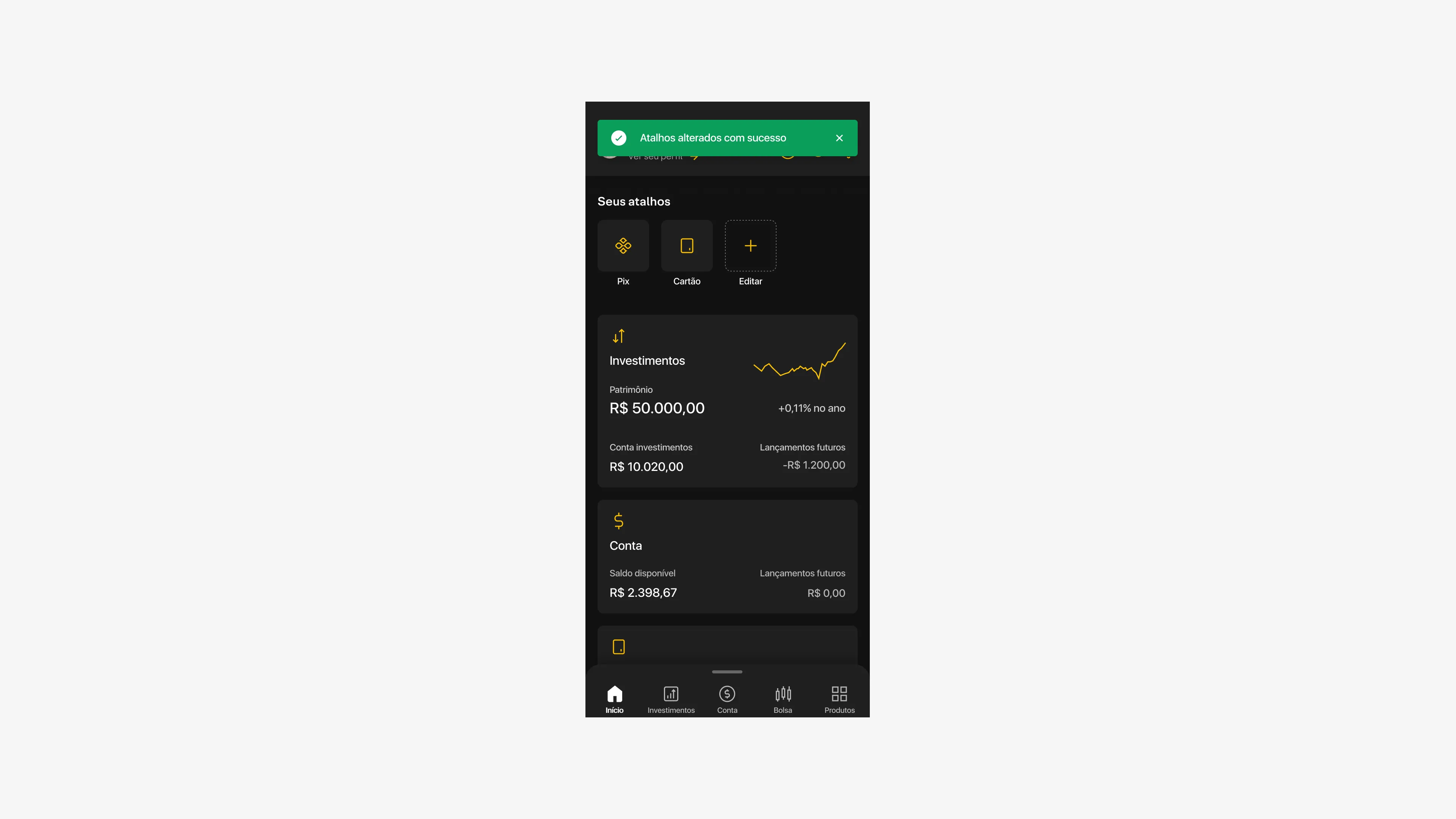 A nova estratégia foca em uma arquitetura modular, escalável e verdadeiramente personalizada. Através da captura de dados, a experiência evolui gradativamente conforme o perfil do usuário (seja ele iniciante, B2B, assessorado ou focado em banking). A solução prevê a criação de espaços de comunicação inteligentes e jornadas "visão 360", garantindo que a interface ofereça o produto certo no momento exato da jornada financeira, dando autonomia aos times internos e clareza para o cliente final.